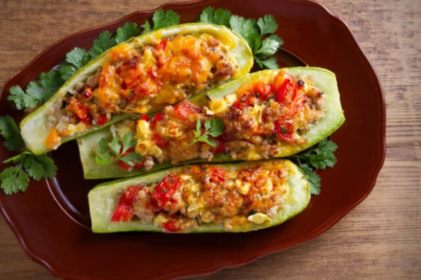 - Выложить лодочки в форму для запекания, посыпать тертым сыром и отправить в разогретую до 180 ̊ С духовку на полчаса.
